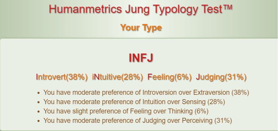 So my 4-letter formula is INFJ, what does this mean? Well the website goes on to explain in more detail about key aspects of people with this personality type such as being 'strongly humanitarian in outlook' with a 'preference for closure and completion'. It then looks at suitable career choices for INFJ types, suggesting that they are 'effective in occupations involving substantial intellectual work, caring for other people, and those that require creativity'. I found this to be very interesting as I actually work full-time as a healthcare assistant in a care home for the elderly whilst having my website & blog on the side. This seems to be appropriate as it combines two points where I should be almost excelling.